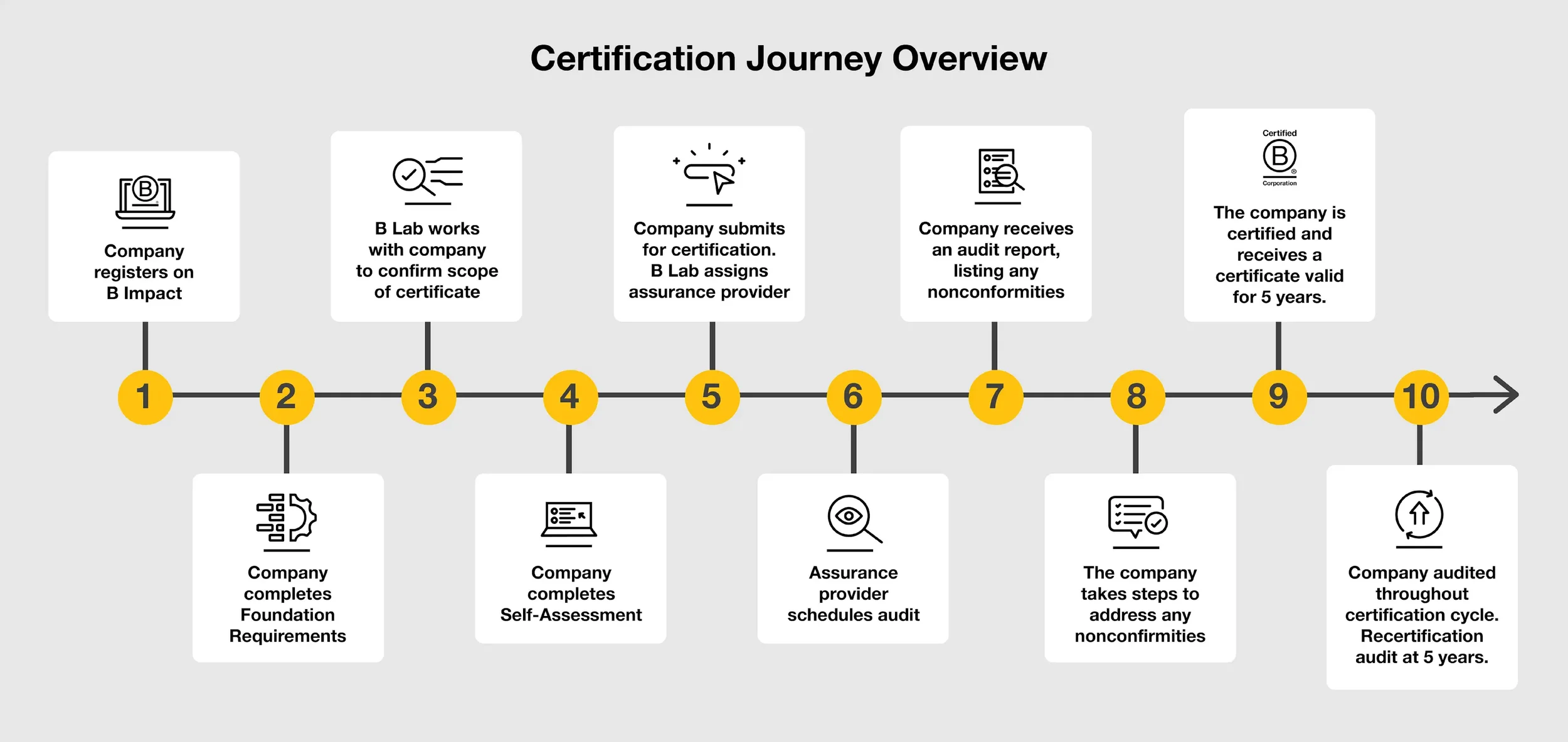 B Lab has now laid out, for the first time, a clear visual roadmap of the full certification journey—from registration and self-assessment through third-party audit and the five-year recertification cycle. The process confirms what many of us expected: certification will require more documentation, more follow-up, and more rigor. For anyone planning to certify or recertify, it’s worth studying this 10-step overview closely.